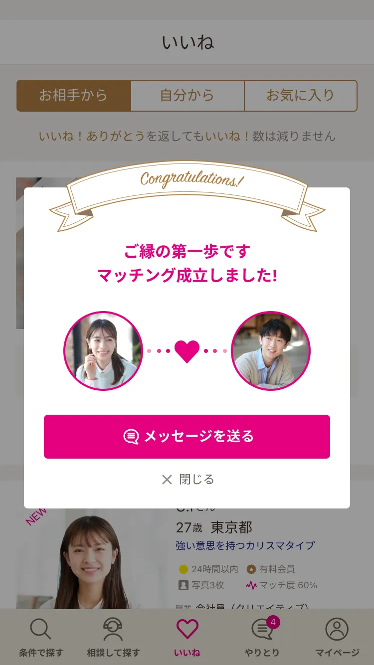 結婚観がぴったり合ったお相手を毎日4人ご紹介!結婚を見据えた真剣な出会いが毎日生まれています
